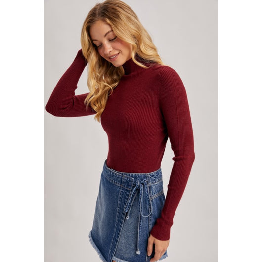 BLUIVY - MOCK NECK RIBBED KNIT TOP | BURGUNDY