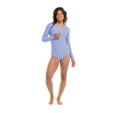The Chanel paddle suit is a water-friendly bodysuit that can be worn in and out of the water. The sporty cross-over style has raglan long sleeves, a zip-front detail, crew neck, flatlock seams, and medium back coverage. Its UPF 50 fabric protects against the sun's rays.